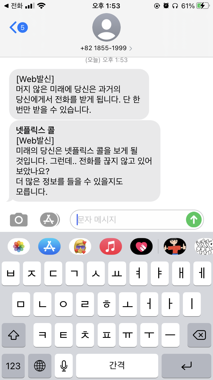 과거의 나와 통화하다가 무섭다고 어떤 사람이 이어폰 빼버려서 통화가 끊겼다